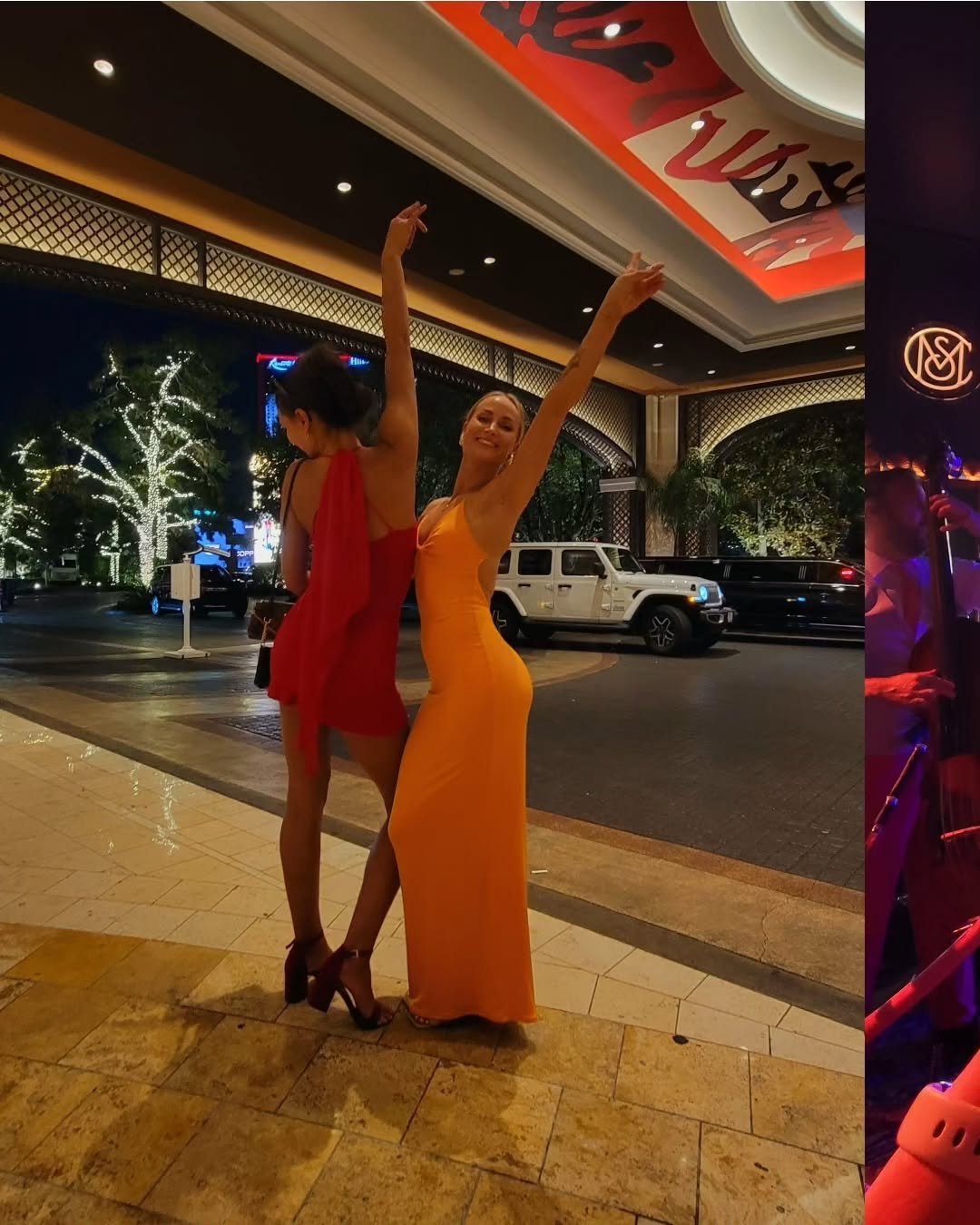 Two bold dresses, one red mini and one sleek orange maxi, under glowing hotel lights. This is Vegas energy at its finest. Clean silhouettes, saturated color, arms in the air like the night just started.