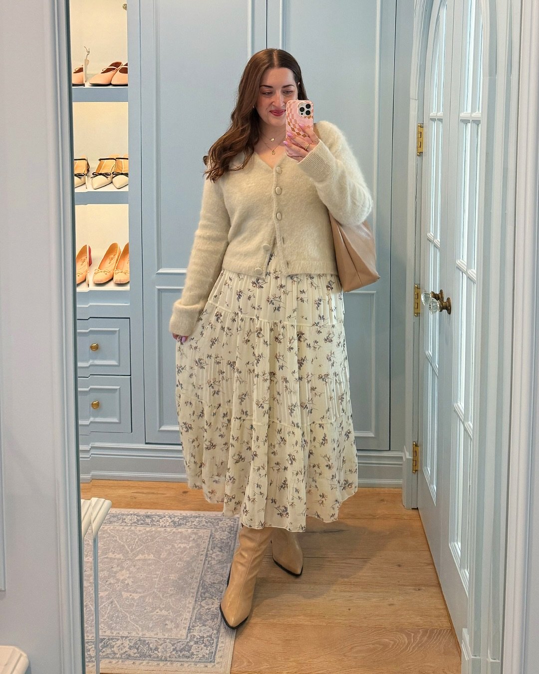 The creamy neutral tones keep the palette light and airy, while the tall boots add warmth and structure. It’s the sort of outfit that carries you from church to brunch to a relaxed afternoon walk without missing a beat.