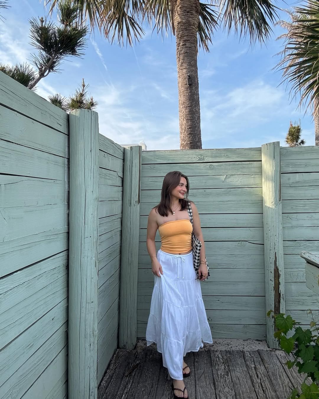 There’s something about a simple strapless top and a flowy white skirt that instantly feels like vacation mode. The soft peachy-orange tube top brings just enough color, while the tiered skirt keeps everything light, airy, and perfect for warm coastal afternoons.