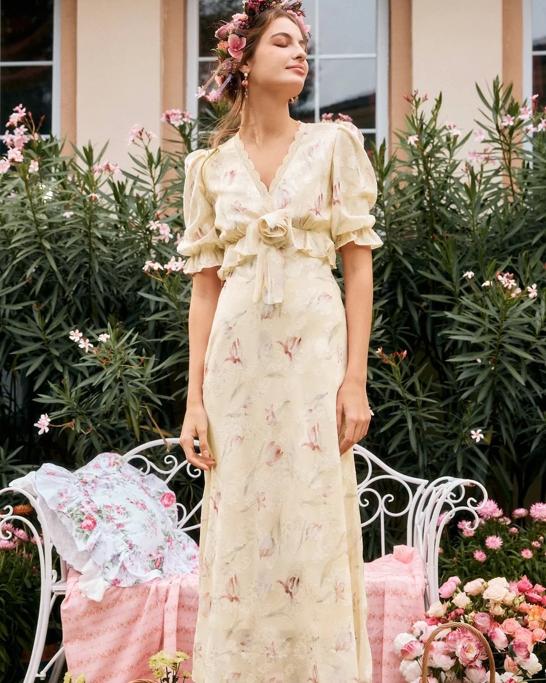 A soft yellow maxi dress in spring is basically a love letter to sunshine. The delicate floral print scattered across the fabric feels light and joyful, perfect for those warm Easter afternoons when everything outside seems to be blooming.