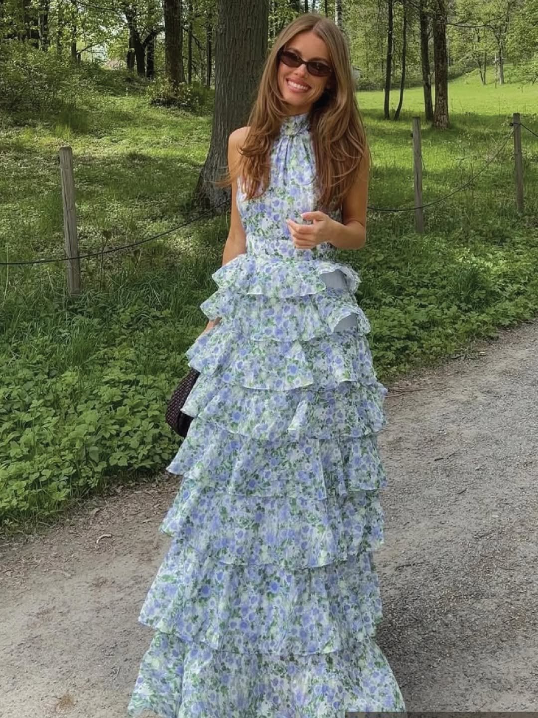 The high neckline keeps it elegant, while the tiered texture adds drama without feeling overdone. Add oversized sunglasses and a small woven bag, and suddenly it’s giving “springtime in the countryside” energy in the most effortless way.