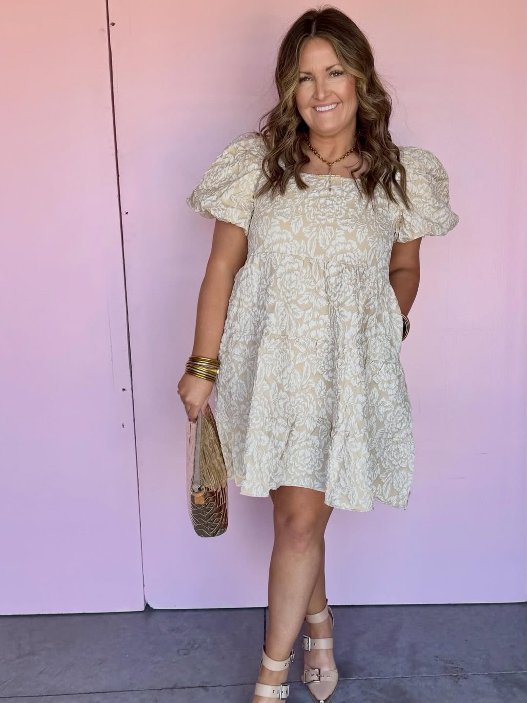 This dress is proof that neutrals can still feel incredibly charming. The soft beige floral pattern paired with puff sleeves gives it a romantic, slightly vintage silhouette that feels perfect for spring gatherings.