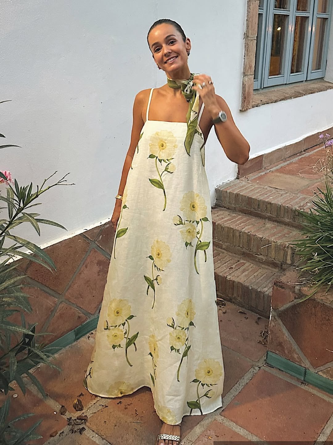 The relaxed silhouette keeps it effortless, while the thin straps and scarf detail add that breezy European holiday vibe. It’s the sort of dress that looks equally beautiful at brunch tables or wandering through a flower market with a coffee in hand.