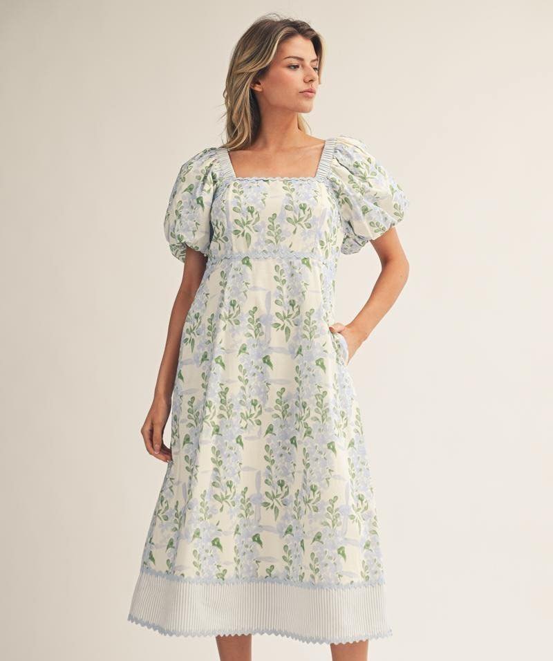 There’s a quiet elegance to a puff sleeve midi dress, especially when it’s covered in soft botanical prints. The pale blue and green pattern feels fresh and airy, like it belongs somewhere between a countryside picnic and a charming Easter lunch.