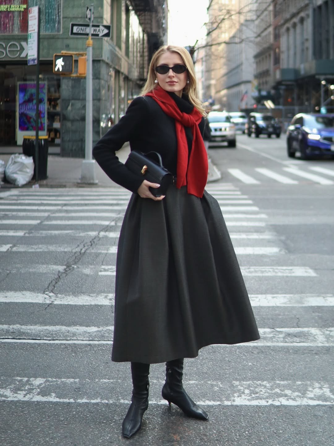 A full black midi skirt styled with tall boots and a tailored coat feels cinematic on a city crosswalk. Then comes the red scarf, bold, intentional, impossible to ignore.