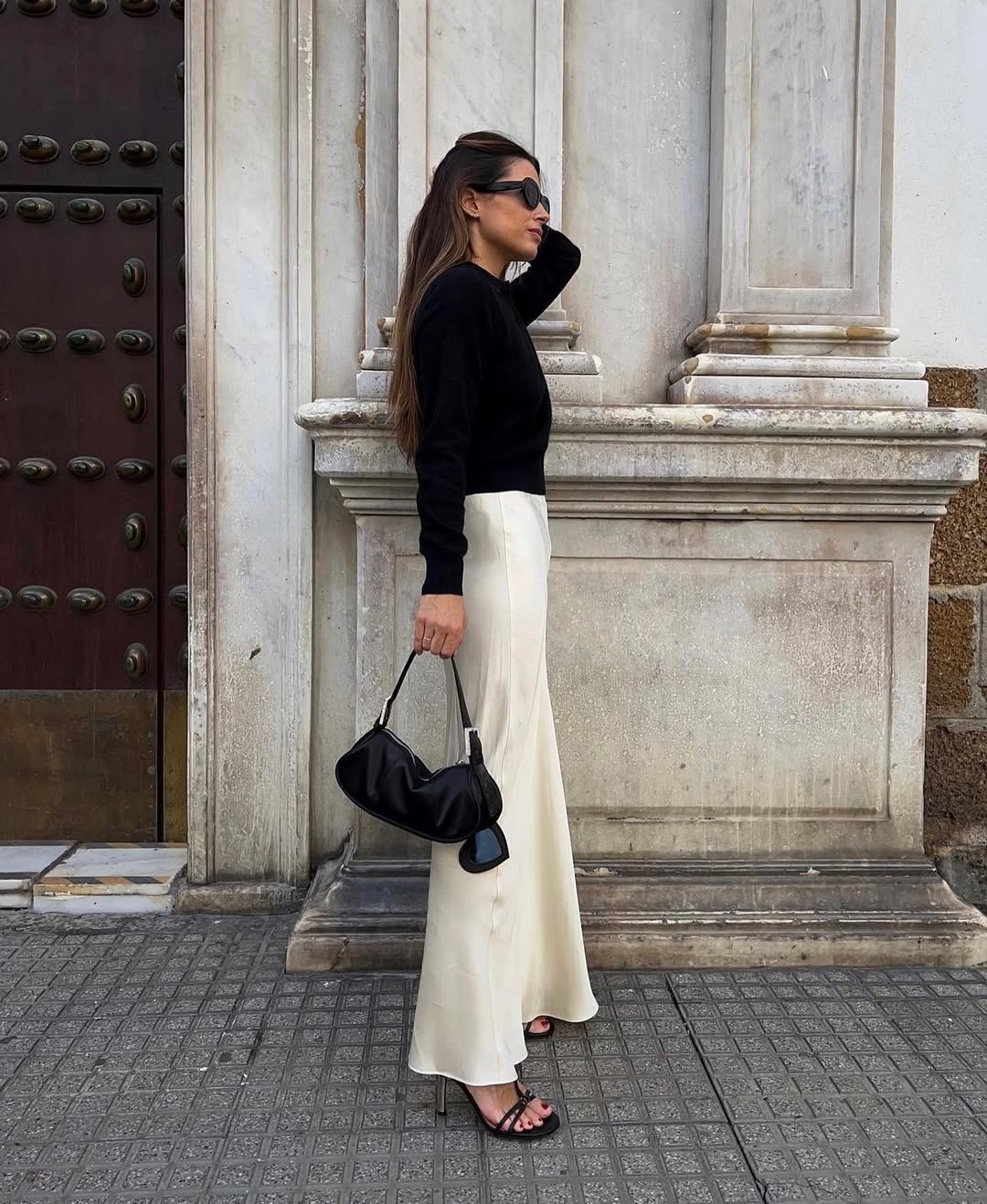 A fitted black sweater paired with a flowing ivory maxi is one of those combinations that never misses. The high contrast feels timeless, especially styled with sleek heels and a structured black bag.