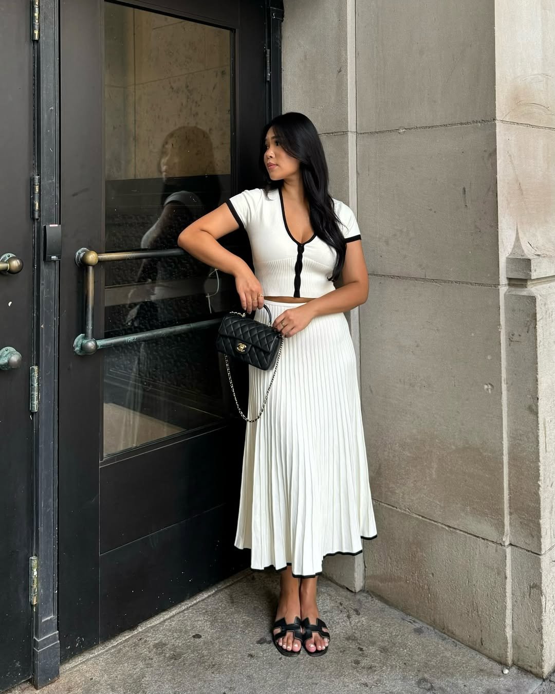 A ribbed cream knit top with black trim paired with a matching pleated long skirt is the definition of refined. The black sandals and quilted bag echo the contrast, tying everything together without shouting.