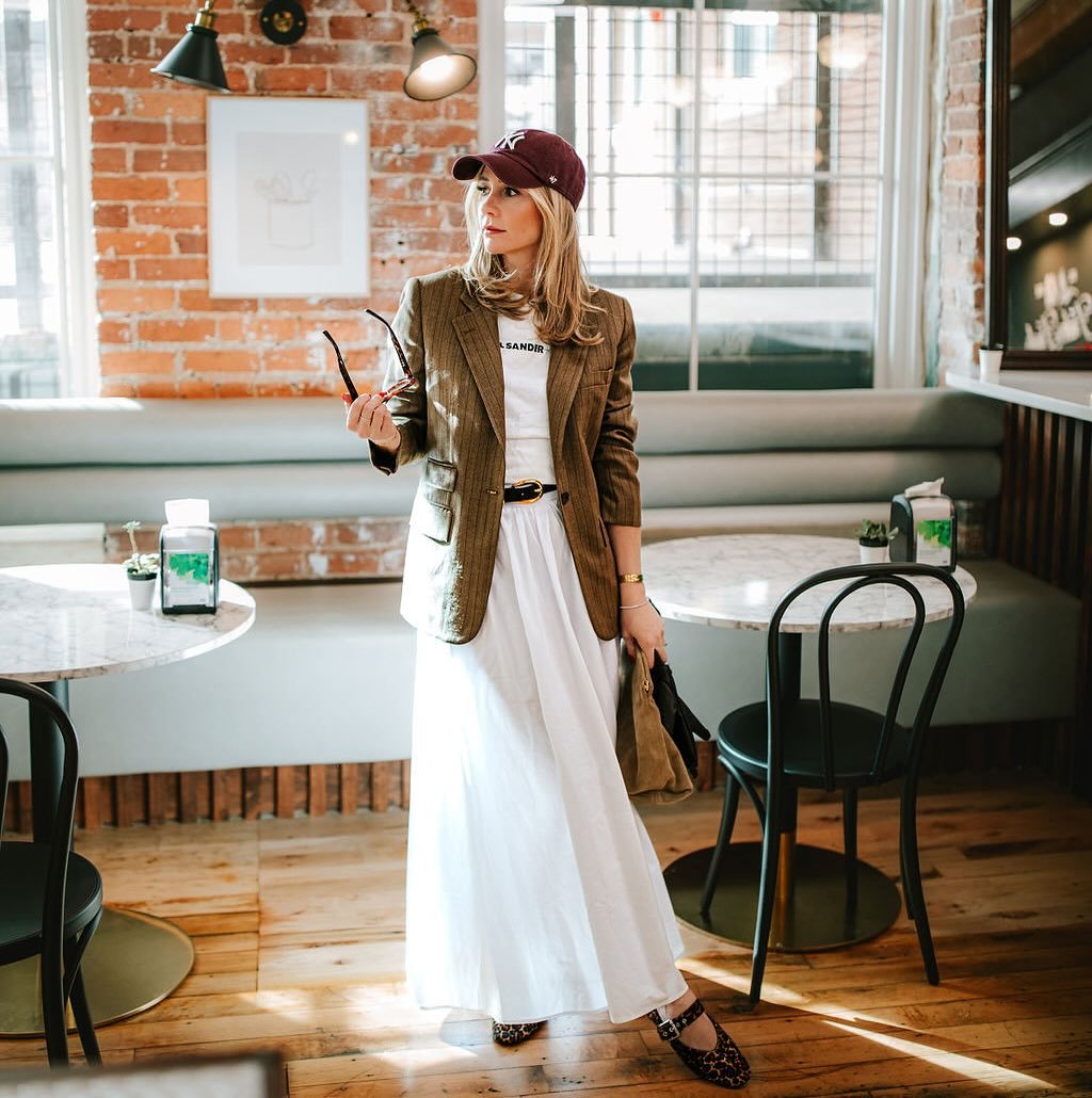 A crisp white maxi skirt layered with a tailored blazer and a baseball cap feels like a masterclass in high-low styling. Leopard flats peek out beneath the hem, adding a playful twist.