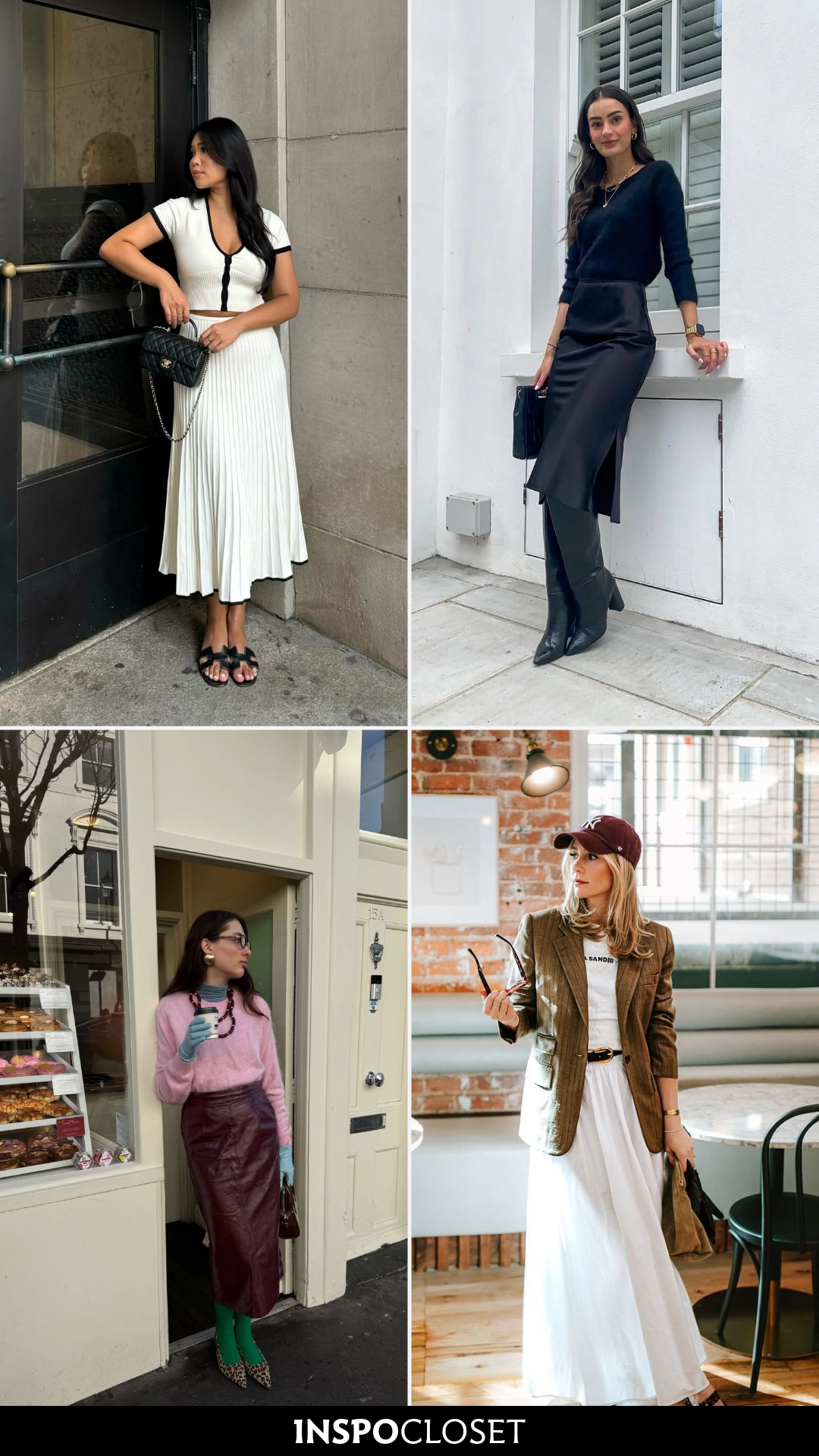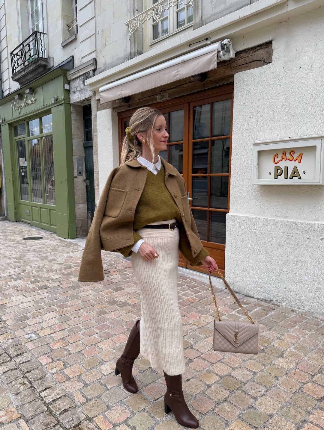 A ribbed cream midi skirt layered with a moss knit, crisp white collar, and cropped camel jacket feels cozy yet composed. The tall brown boots and quilted chain bag bring it all together.