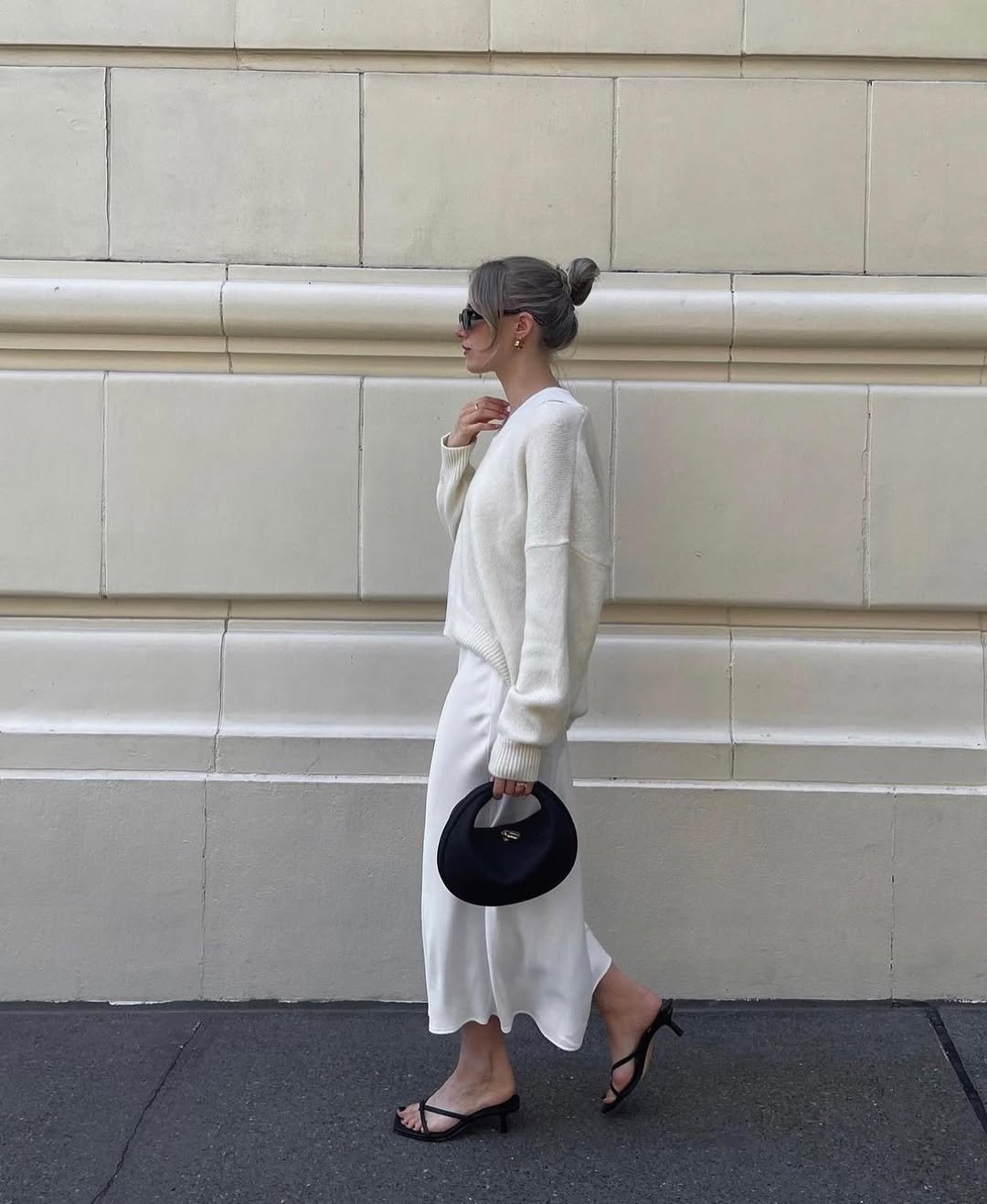 An ivory knit layered over a silky cream slip skirt is minimalism done right. The lines are clean, the palette is soft, and the black accessories add just enough contrast to keep it sharp.