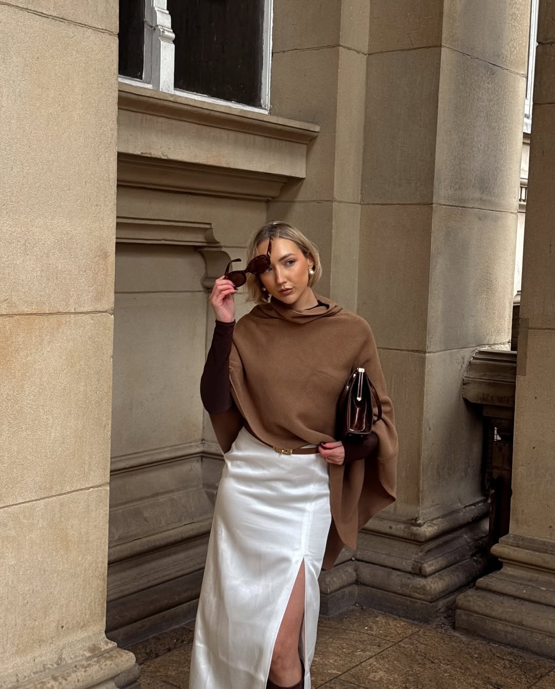 A silky cream midi with a subtle slit paired with a rich brown top and draped knit feels timeless. The tonal layering adds depth without overwhelming the look.