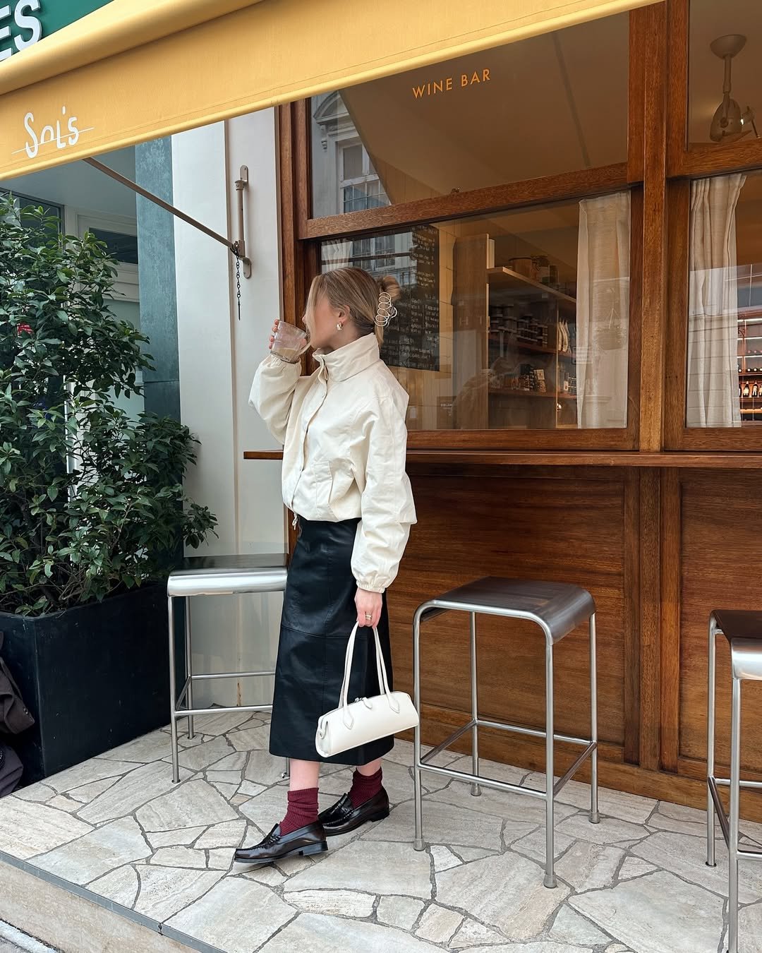 I love the contrast of textures here. Smooth leather against soft cotton, polished loafers against cozy socks. It’s the kind of outfit that makes a quick stop at a wine bar feel like a scene.