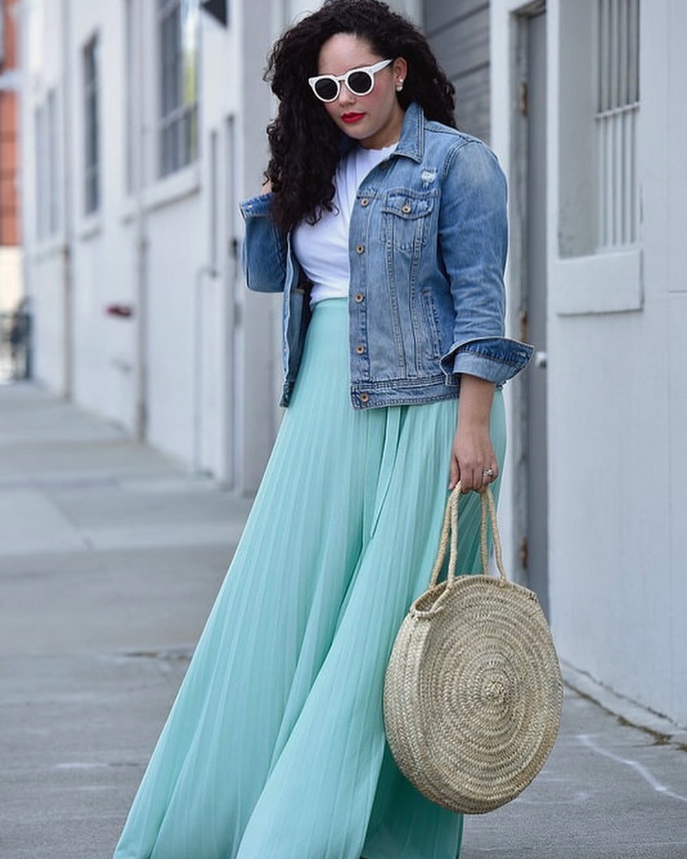 This floaty mint pleated maxi paired with a crisp white tee and denim jacket feels like spring bottled up. The pleats catch every step, creating that soft, swish effect that makes long skirts so addictive to wear.