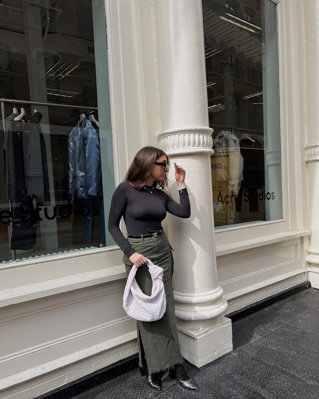 This look is all about sleek structure. A fitted black long sleeve tucked into an olive cargo-style maxi, cinched with a belt, creates a long, lean line that feels sharp and intentional. The black boots anchor everything with a little downtown attitude.