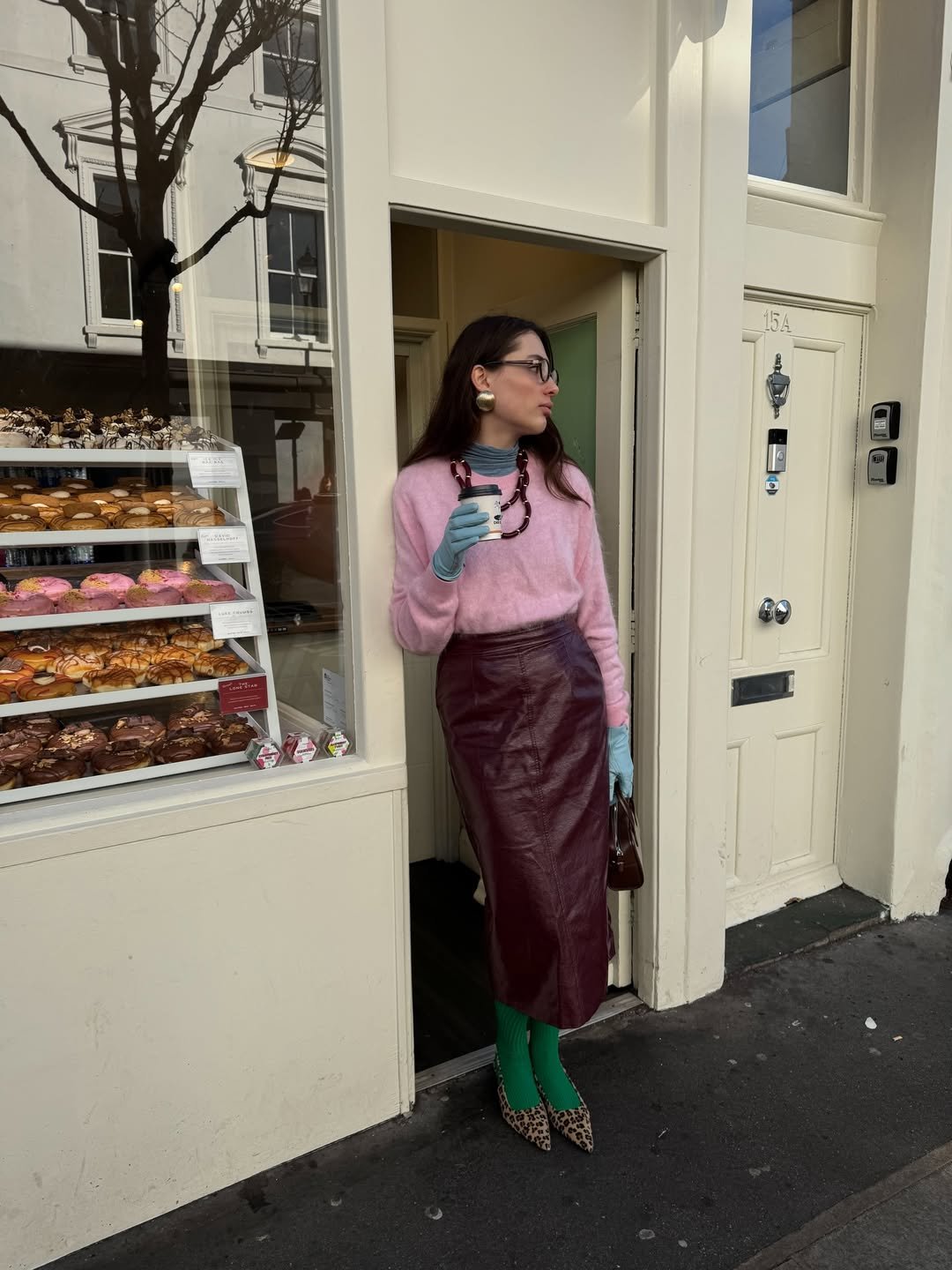 A soft pink sweater tucked into a deep wine leather midi already feels rich, but then come the details. Teal gloves, green tights, leopard heels. It shouldn’t work, but somehow it absolutely does.