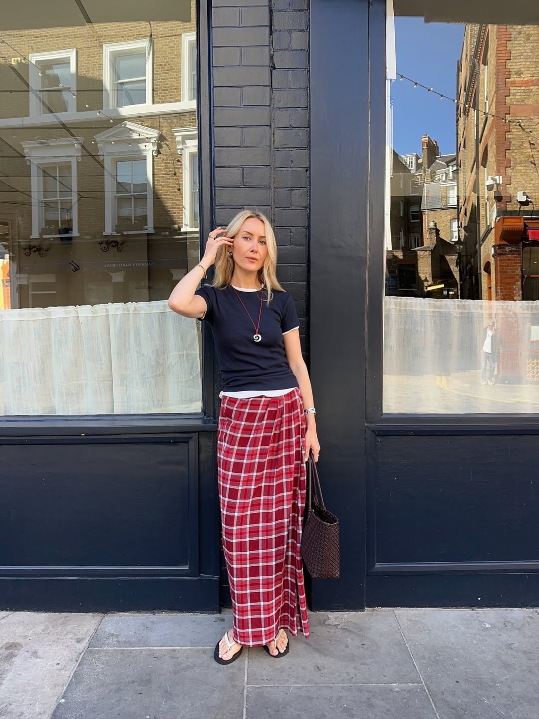 A red plaid maxi with a fitted navy baby tee feels nostalgic in the best way. It’s giving early 2000s London, but styled for now. The flip flops and woven shoulder bag keep it relaxed, like she’s just popping out for coffee but still serving a look.