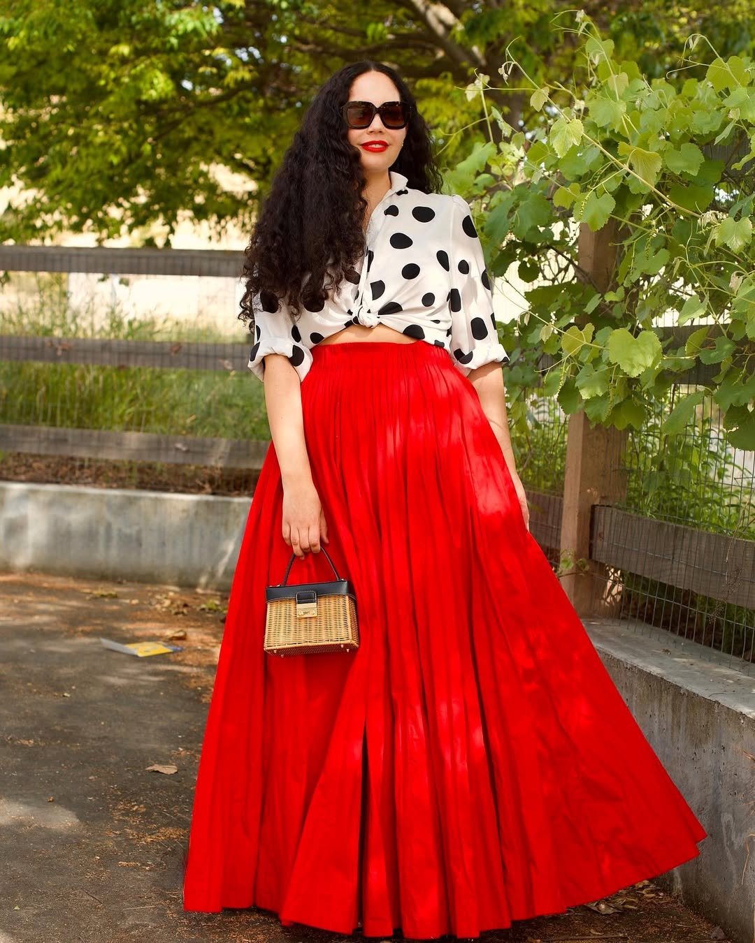 A tied polka dot blouse with a bold red maxi skirt is pure confidence. The high waist elongates the frame, and that saturated red brings drama in the best possible way.