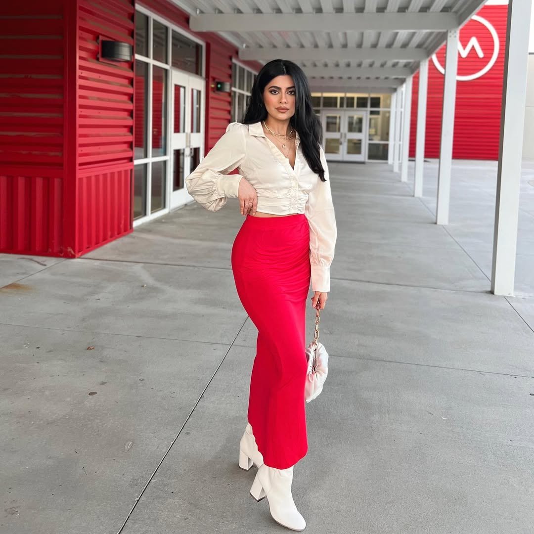 A bold red fitted maxi skirt paired with a soft beige blouse creates instant impact. The clean lines elongate the silhouette, while the white boots add a modern twist.