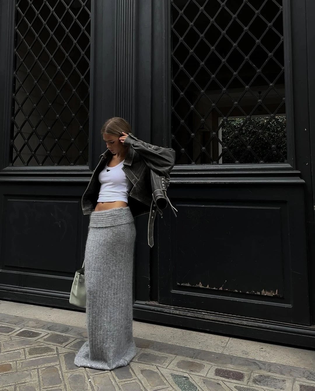 A grey ribbed knit maxi skirt paired with a cropped white tank and a worn-in leather jacket feels effortlessly cool. The mix of soft knit and tough leather creates that perfect tension.
