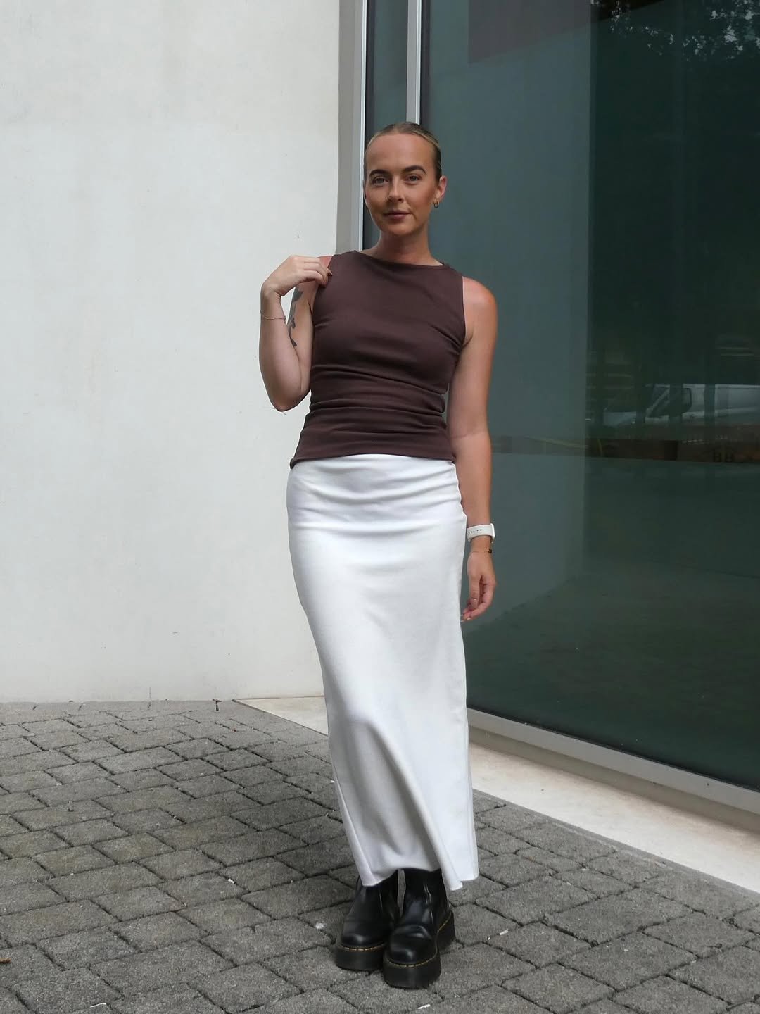 A sleek ivory satin skirt paired with a fitted brown tank and chunky black boots feels quietly bold. The mix of softness and weight creates that perfect tension.