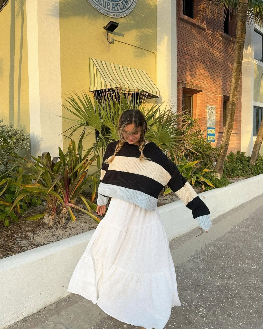 An oversized striped sweater layered over a billowy white maxi skirt feels like comfort dressing done right. The mix of cozy knit and airy cotton gives that perfect balance of texture.