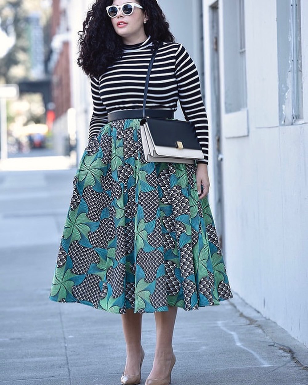 A black-and-white striped top paired with a full, graphic green midi skirt is the kind of mix that turns sidewalks into runways. The volume of the skirt gives it movement, while the fitted knit up top keeps the proportions perfectly balanced.