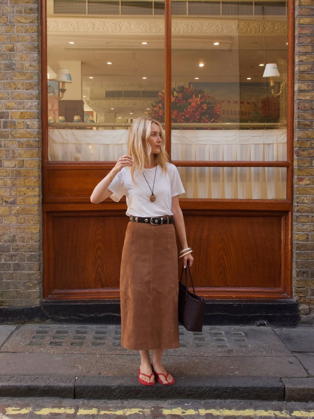 A classic white tee tucked into a camel suede midi is one of those combinations that never fails. Add a belt, a woven bag, and a pair of red flip flops, and suddenly minimal feels styled.