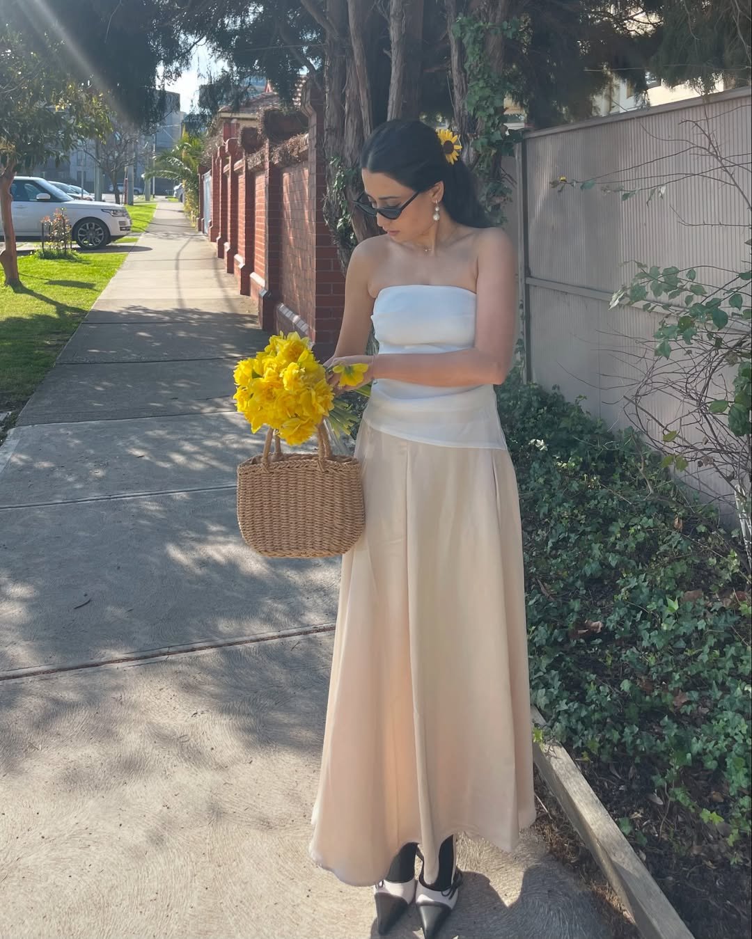 There’s something so cinematic about a strapless cream top paired with a flowing beige maxi. Add a woven basket bag stuffed with bright yellow blooms and suddenly the whole sidewalk feels like a summer postcard. The pointed flats and sleek sunglasses keep it polished, not precious.