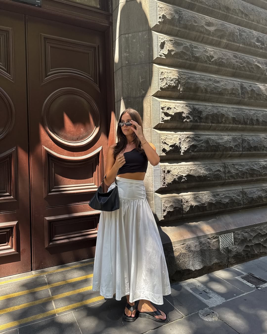 It’s easy, feminine, and quietly romantic. The white sandals and woven bag keep it grounded, making it perfect for slow afternoons and sun-warmed sidewalks.