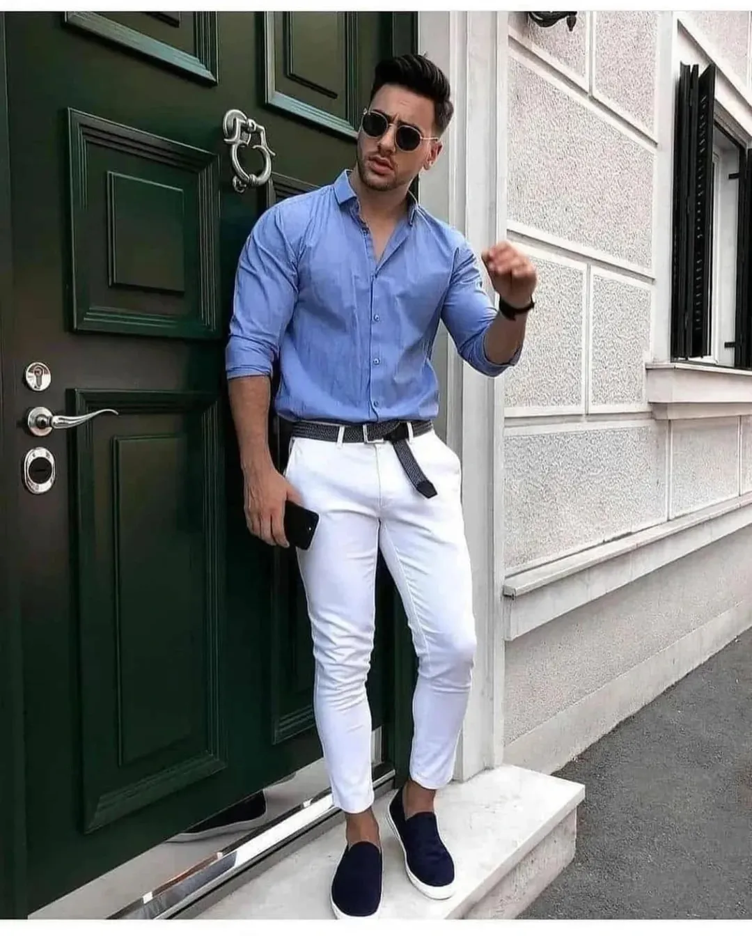 A light blue shirt with white trousers is always a strong move — but pairing it with navy slip-ons takes it somewhere smarter. It’s tailored, fitted, and streamlined without feeling tight or try-hard.
