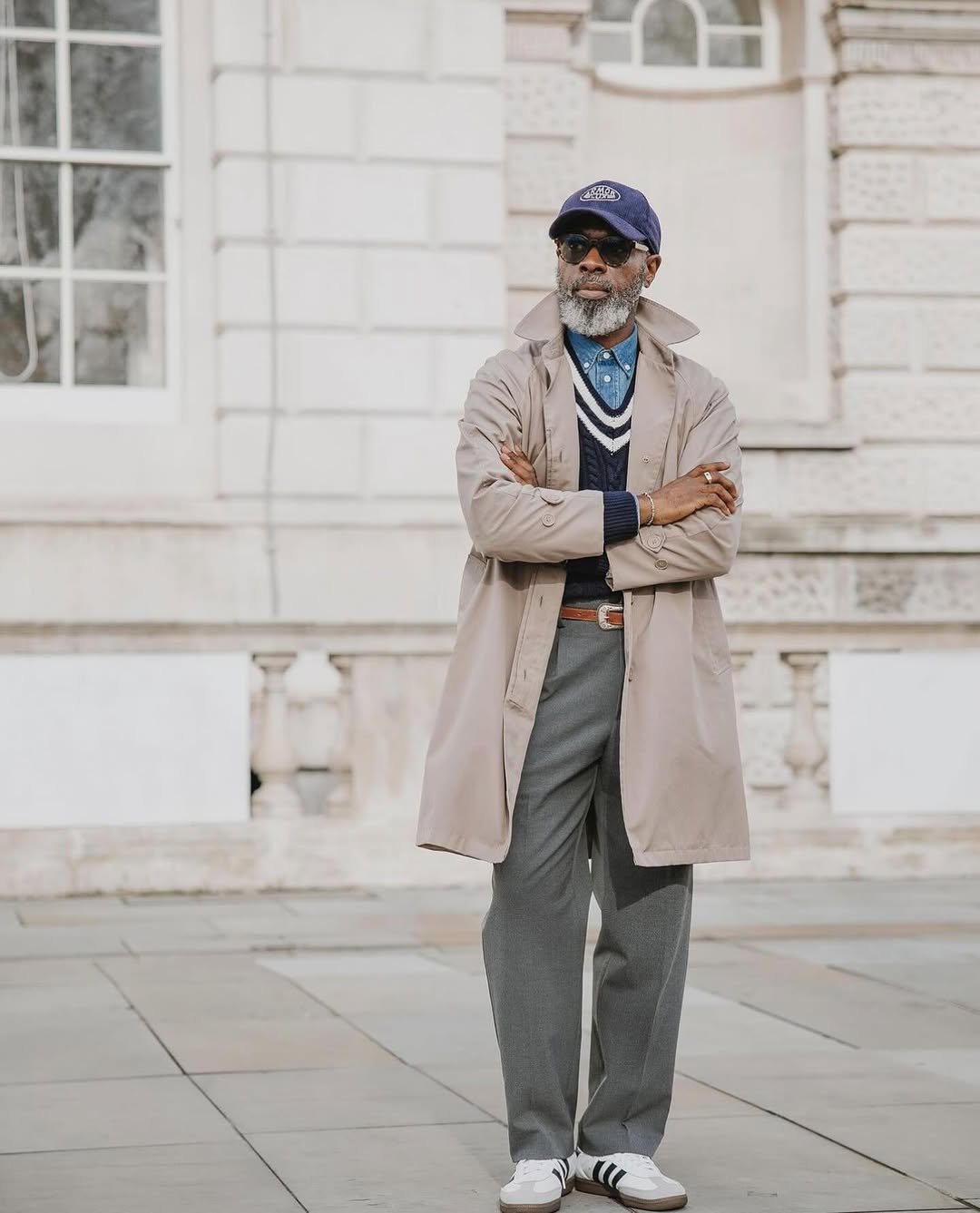 A trench coat over a knit vest and denim shirt is one of those timeless combinations that never loses its charm. The gray trousers and crisp sneakers give it a current spin, especially with the cap and sunglasses adding personality.