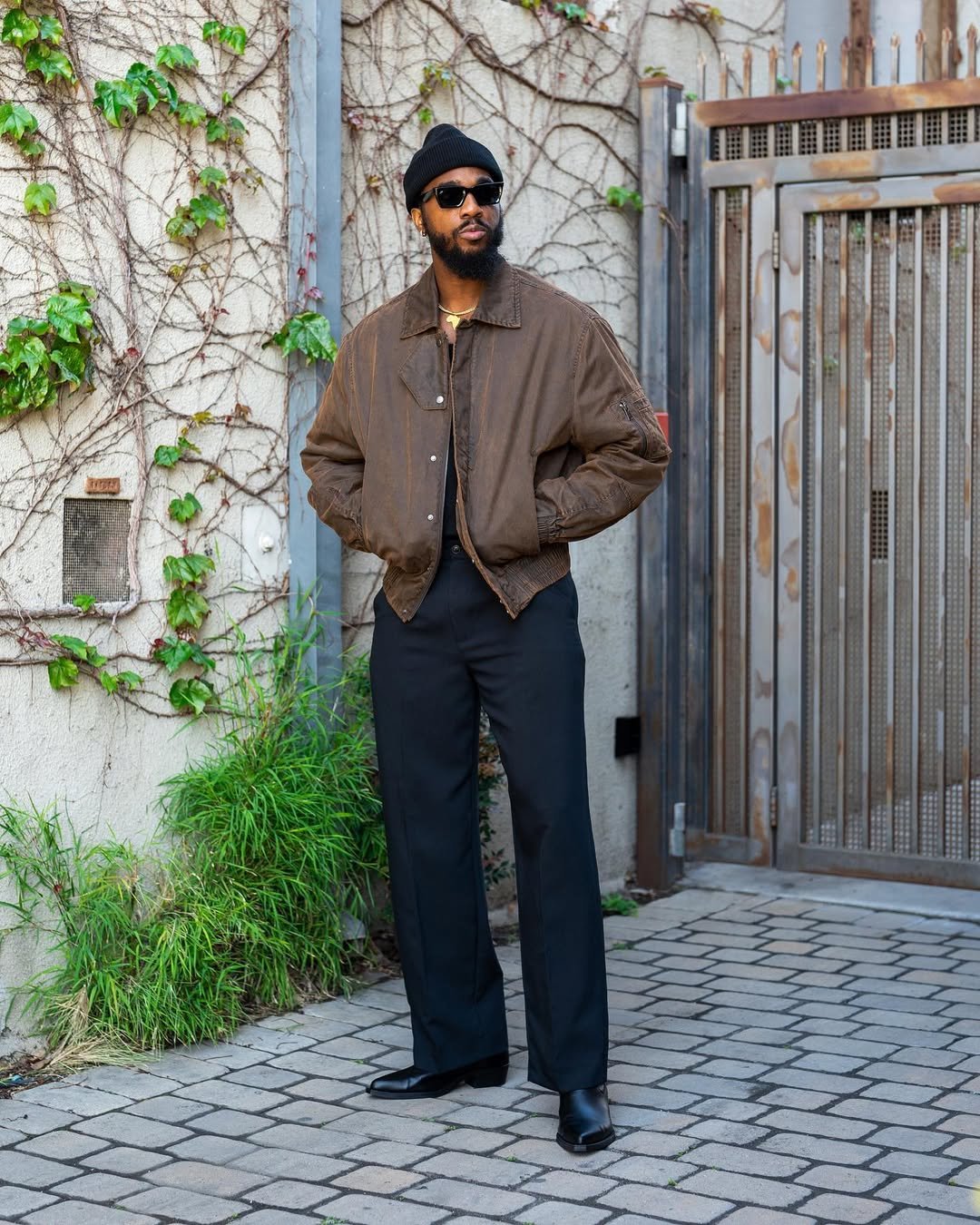 Brown bomber. Black trousers. Clean black boots. That’s it—that’s the formula. It’s sleek, it’s urban, and it doesn’t need extras to make a point. The beanie and sunglasses just seal the vibe.