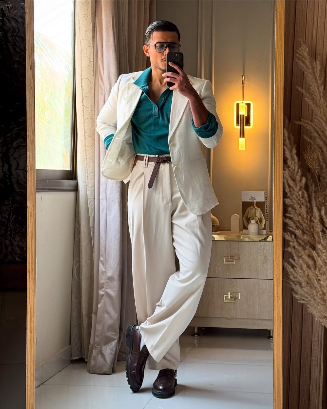 This one is pure statement energy. The cream suit against that deep emerald knit? Clean, rich, and unapologetically sharp. The brown belt and loafers ground the whole look so it doesn’t feel too “resort catalogue” — it feels intentional.