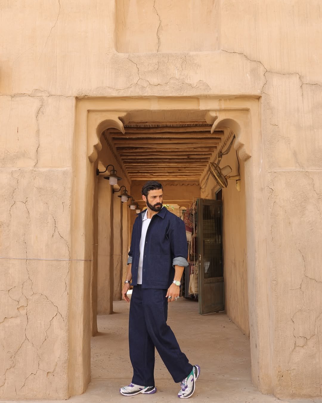 A navy overshirt set against warm, textured walls feels grounded and intentional. Paired with a simple white tee and relaxed trousers, the look balances minimalism with presence. The sneakers keep it contemporary without stealing focus.