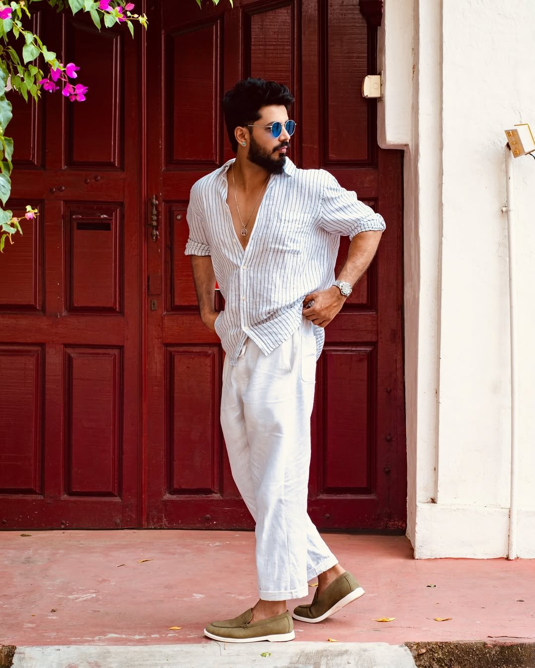 Striped linen shirt, white relaxed trousers, olive loafers — this is warm-weather ease at its best. The open collar and subtle accessories give it personality without cluttering the look.