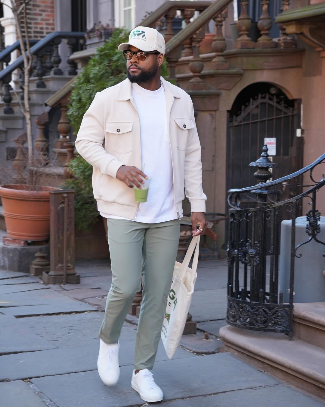 Cream jacket, sage trousers, crisp white sneakers—this is spring freshness in outfit form. The tonal layering feels light and intentional, and the baseball cap keeps it grounded.