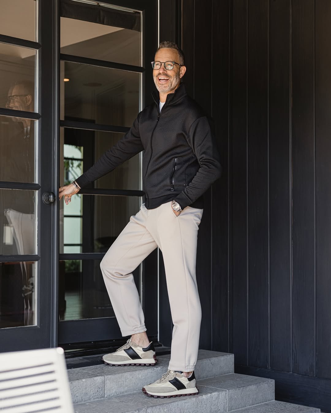 Black zip-up, tailored beige trousers, statement sneakers. It’s sporty — but refined. The jogger-style hem paired with a structured top half creates that perfect high-low balance.