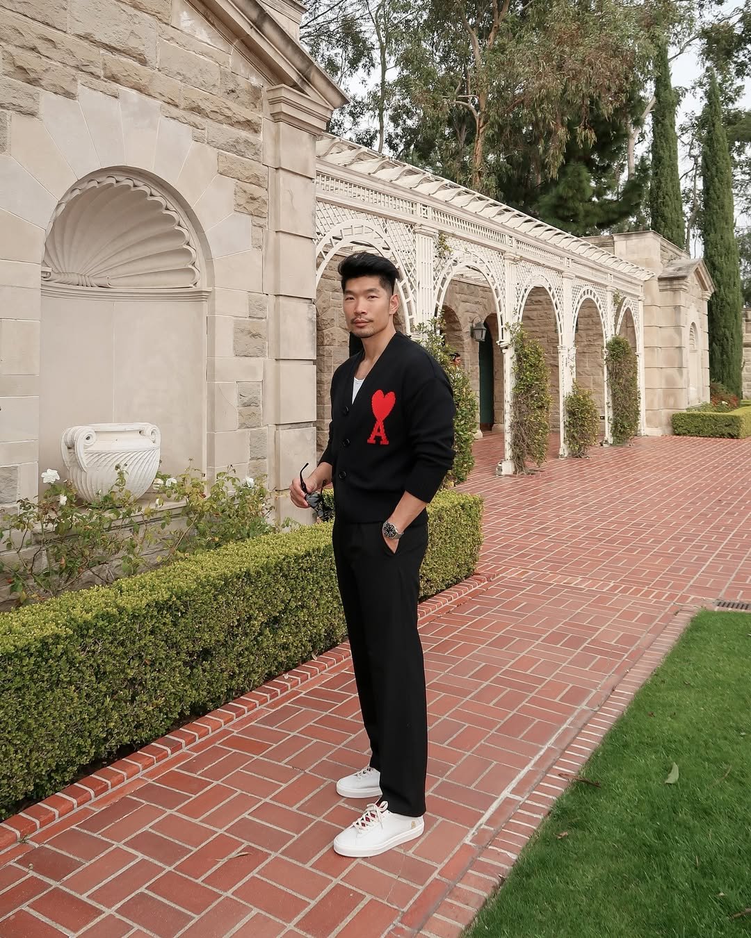A black cardigan with a bold heart motif paired with tailored trousers and white sneakers feels both playful and sleek. The setting, all arches and brick, only amplifies the polished energy.