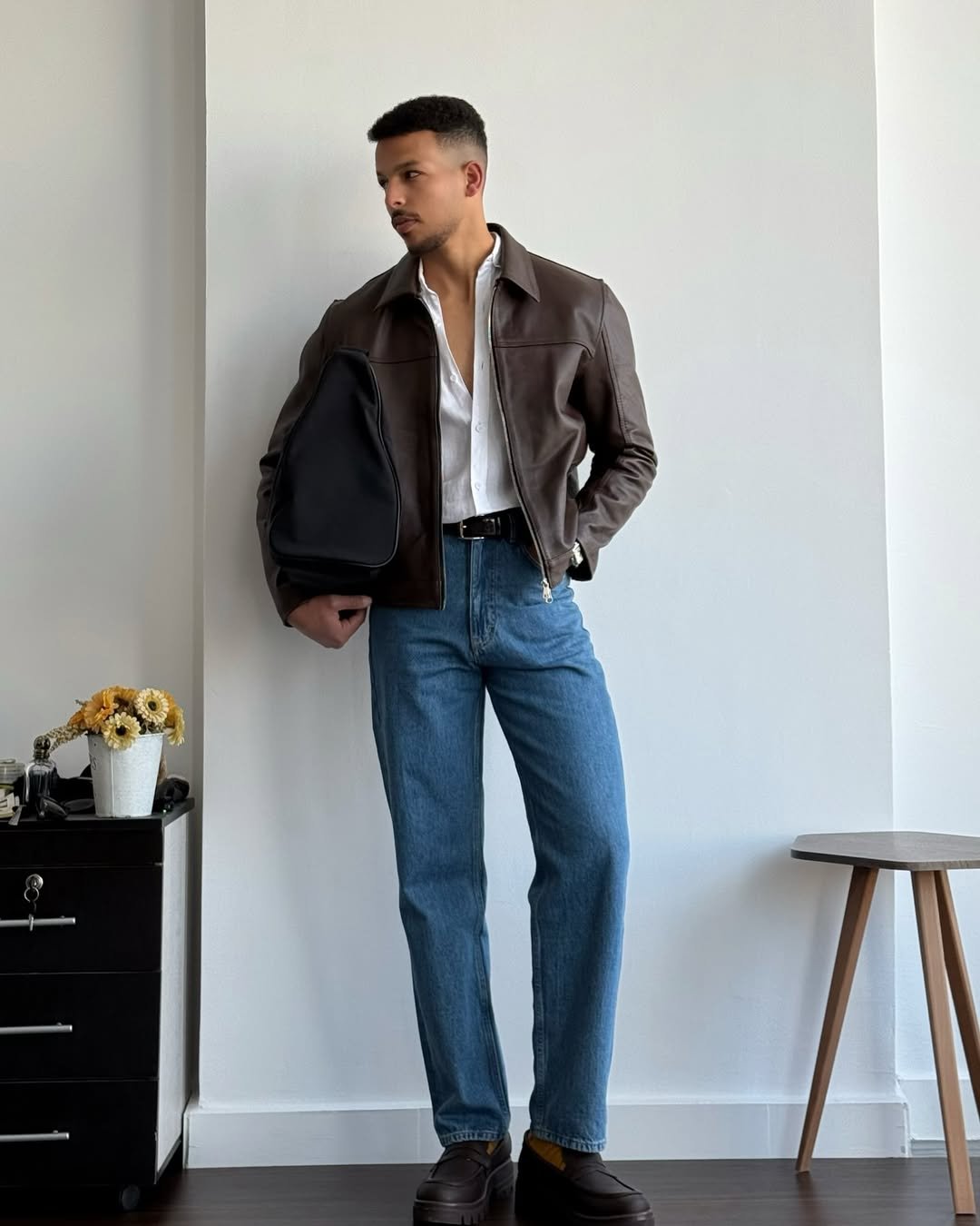 A brown leather jacket in March? Always a good idea. Paired with a crisp white shirt and straight-leg denim, this look hits that sweet spot between timeless and current. The silhouette is clean, but not stiff—like you’ve got somewhere important to be, but you’re not rushing.