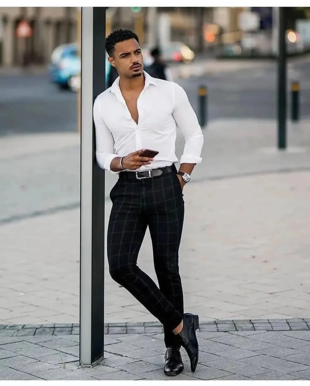 White shirt up top, dark checked trousers down low — that contrast hits instantly. The slim cut and sharp footwear elevate it from casual to city-ready in seconds.