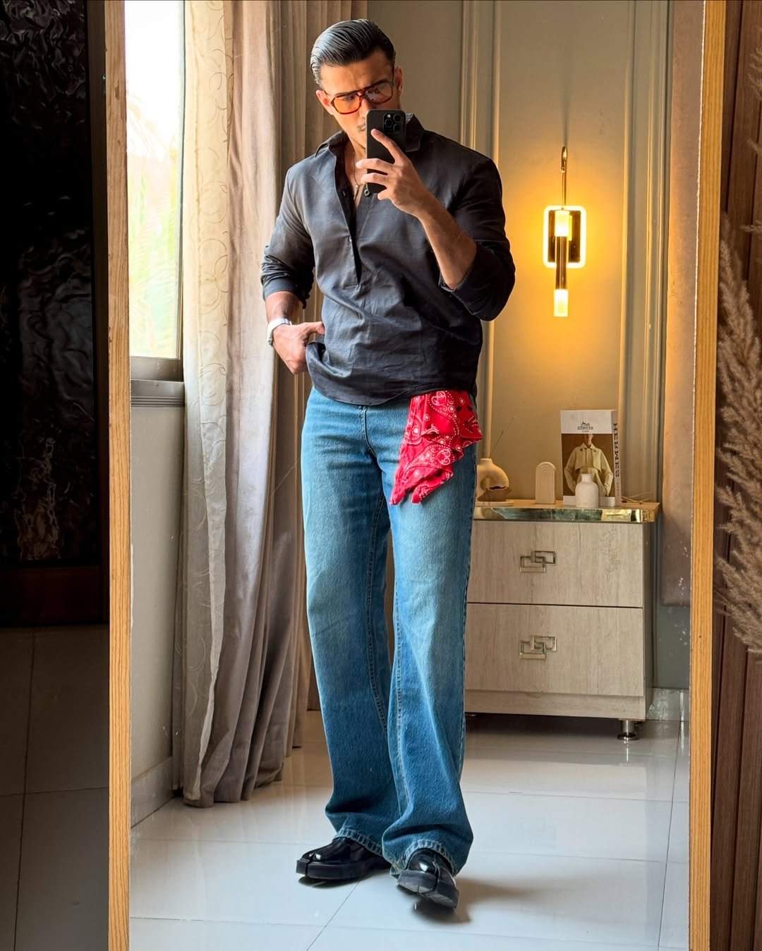 Dark henley, relaxed denim, chunky loafers—this one leans into that effortless cool. The red bandana detail adds just enough contrast to break up the monochrome feel.