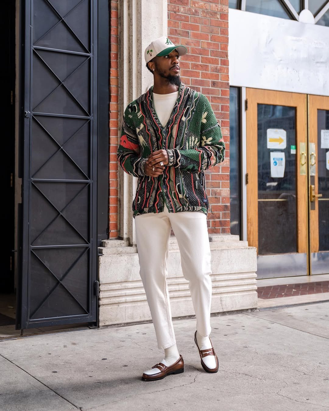 This cardigan is not shy—and that’s exactly why it works. The mix of earthy greens, reds, and cream against tailored ivory trousers feels bold but balanced. It’s preppy meets street in the best way.