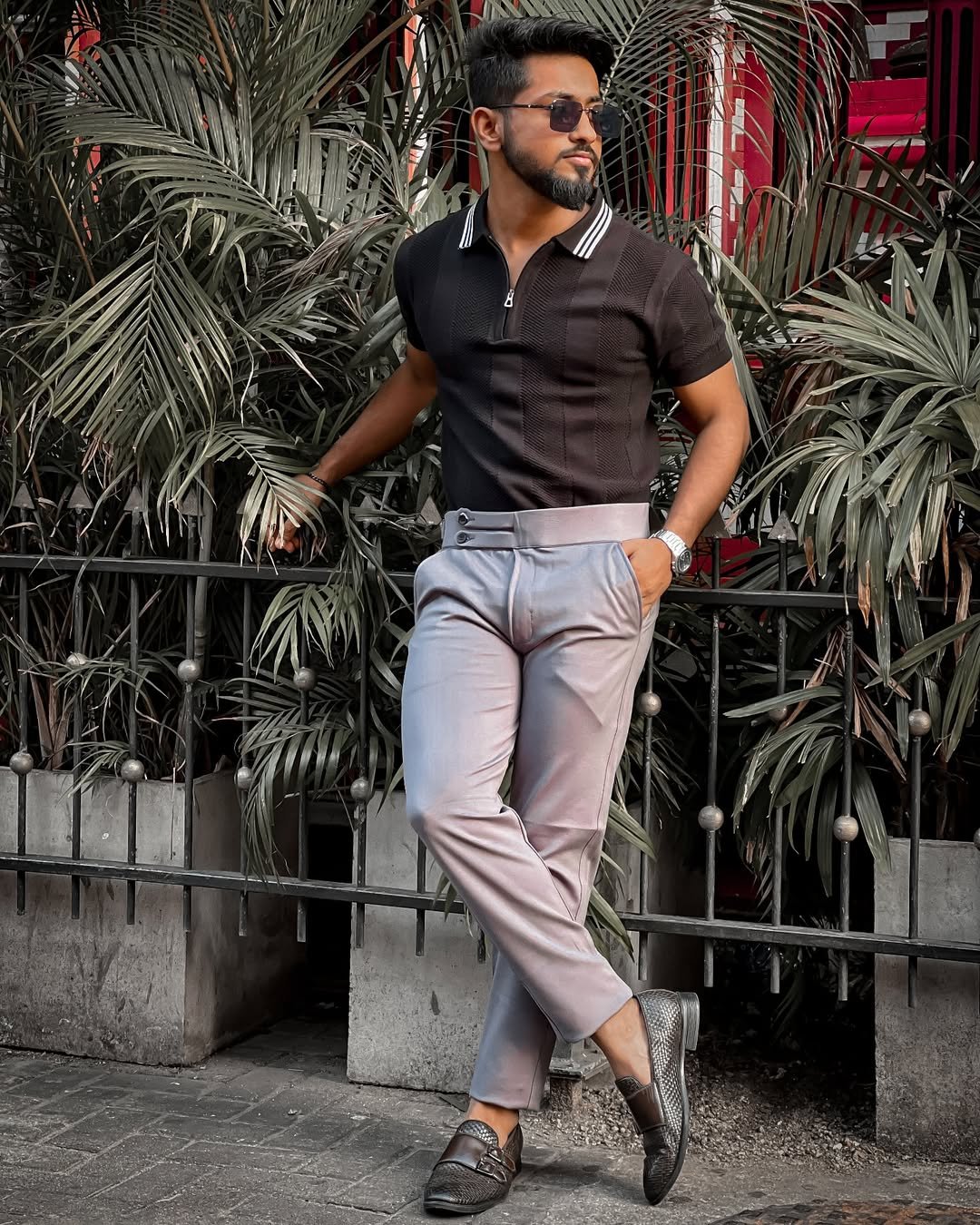 A fitted knit polo tucked into tailored trousers? That’s grown and confident. The high-waisted cut elongates the frame, and those textured loafers add depth without being loud.