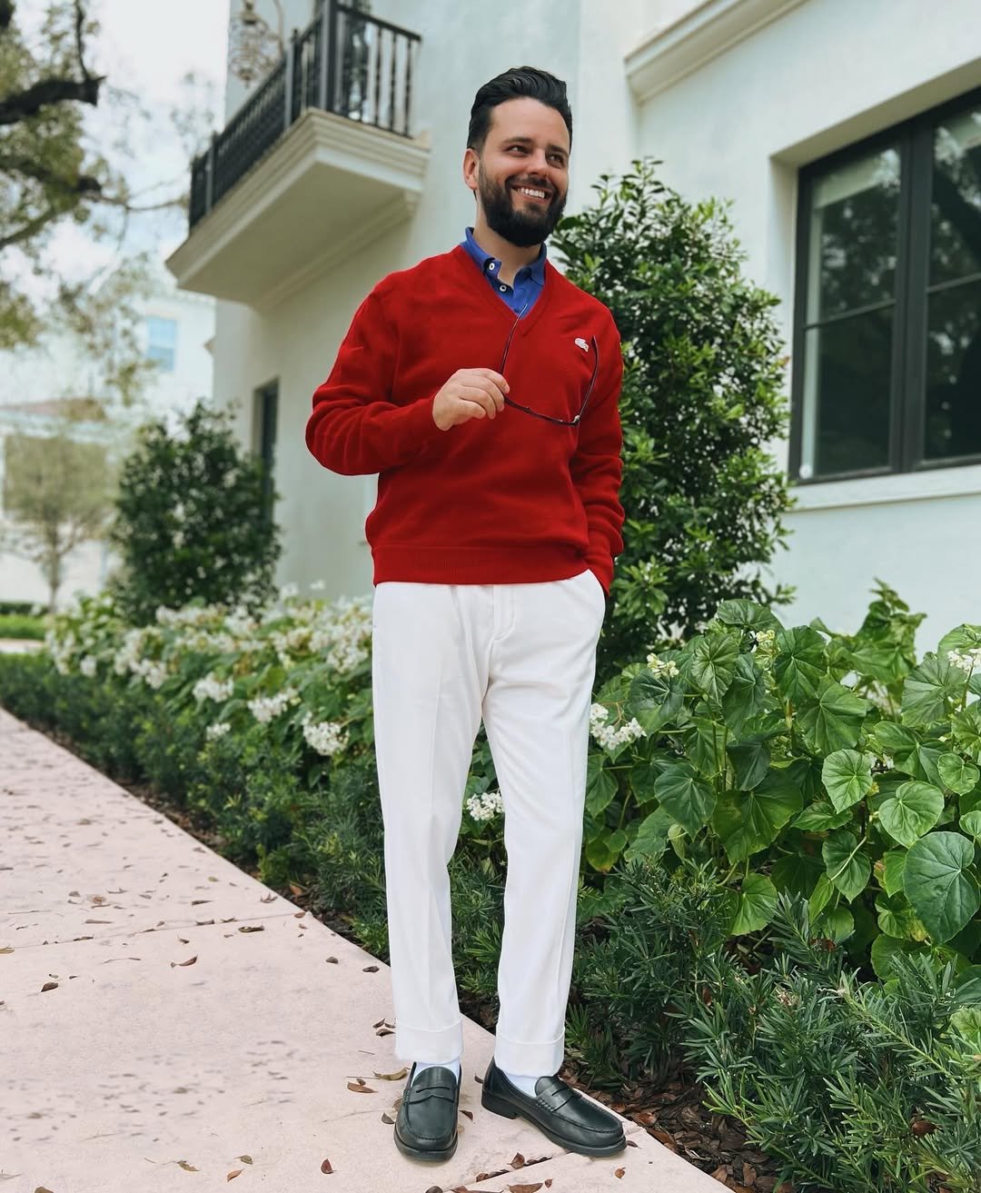 A bold red V-neck layered over a blue collared shirt with crisp white trousers feels fresh and confident. The loafers elevate it, turning what could be preppy into something refined and modern.