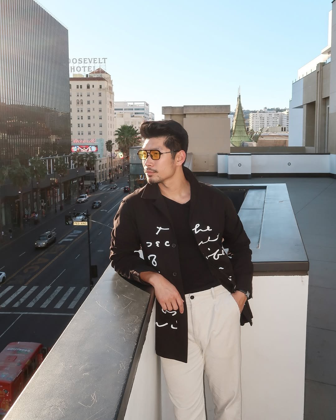A black tee with subtle script detailing layered under an open jacket and paired with cream trousers captures that golden hour mood perfectly. The sunglasses and skyline backdrop seal the vibe.