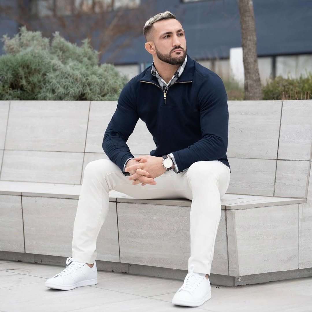 Navy quarter-zip, light trousers, clean white sneakers. It’s streamlined, athletic, and incredibly wearable. Nothing overcomplicated — just solid, well-fitted pieces doing their job.