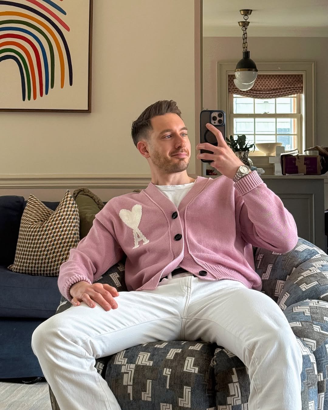 A blush pink cardigan with a graphic heart detail layered over a white tee and cream trousers feels playful in the best way. It’s cozy, but tailored enough to step outside the house and straight into a coffee date.