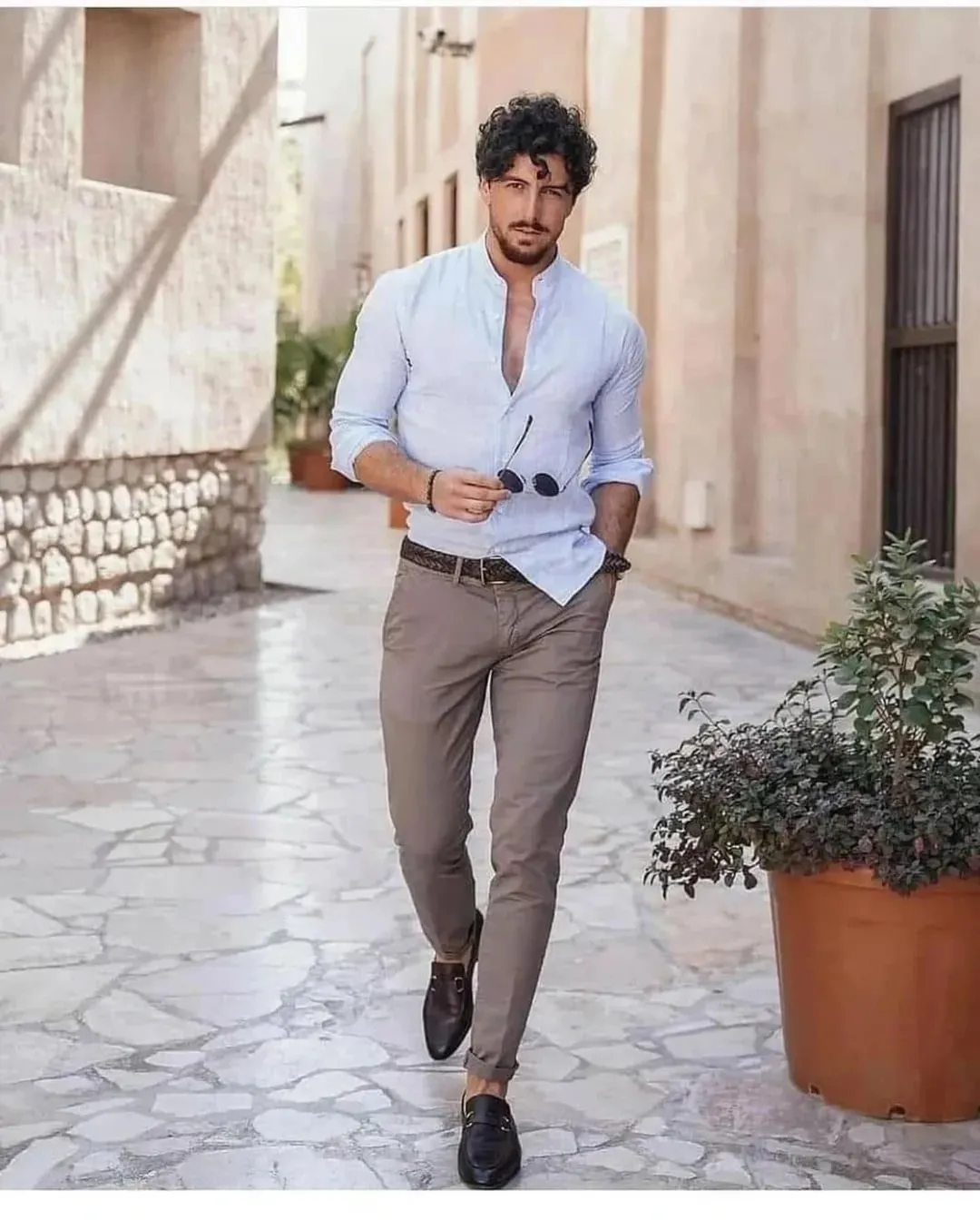 Light blue shirt, tailored tan trousers, dark loafers — this is that timeless “European sidewalk” aesthetic. It’s fitted but fluid, structured but relaxed.