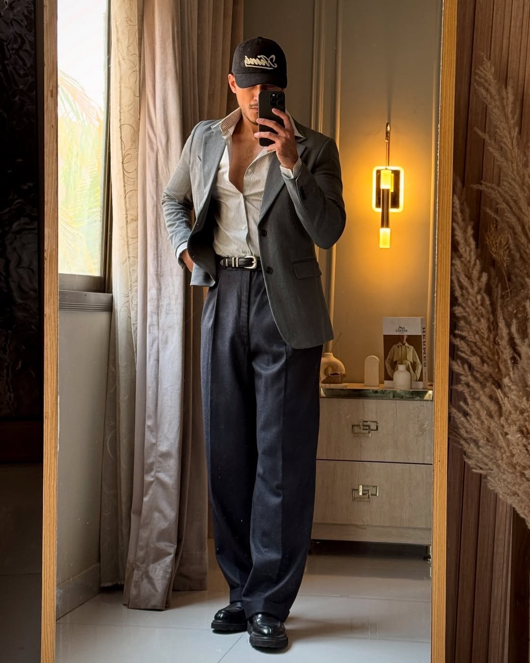 Grey blazer over an open striped shirt? That’s confidence. The relaxed tailoring and fluid trousers keep it modern, while the layered textures add depth.