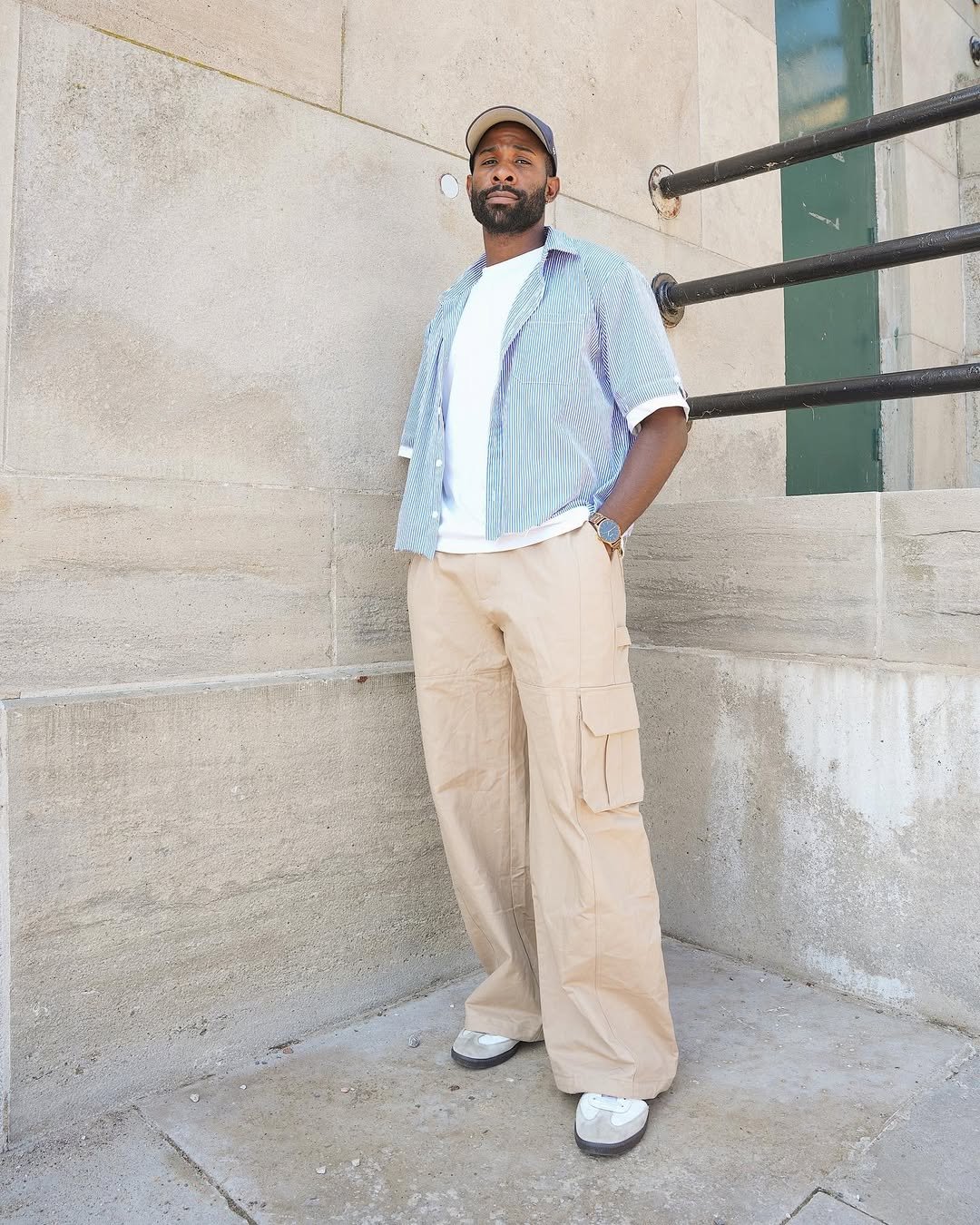 This is how you do relaxed without looking lazy. The striped short-sleeve over a clean white tee feels easy, but those wide-leg cargo trousers bring just enough structure to keep it intentional. The neutral palette—sand, sky blue, and off-white—screams early March when the sun’s out but there’s still a chill in the air.